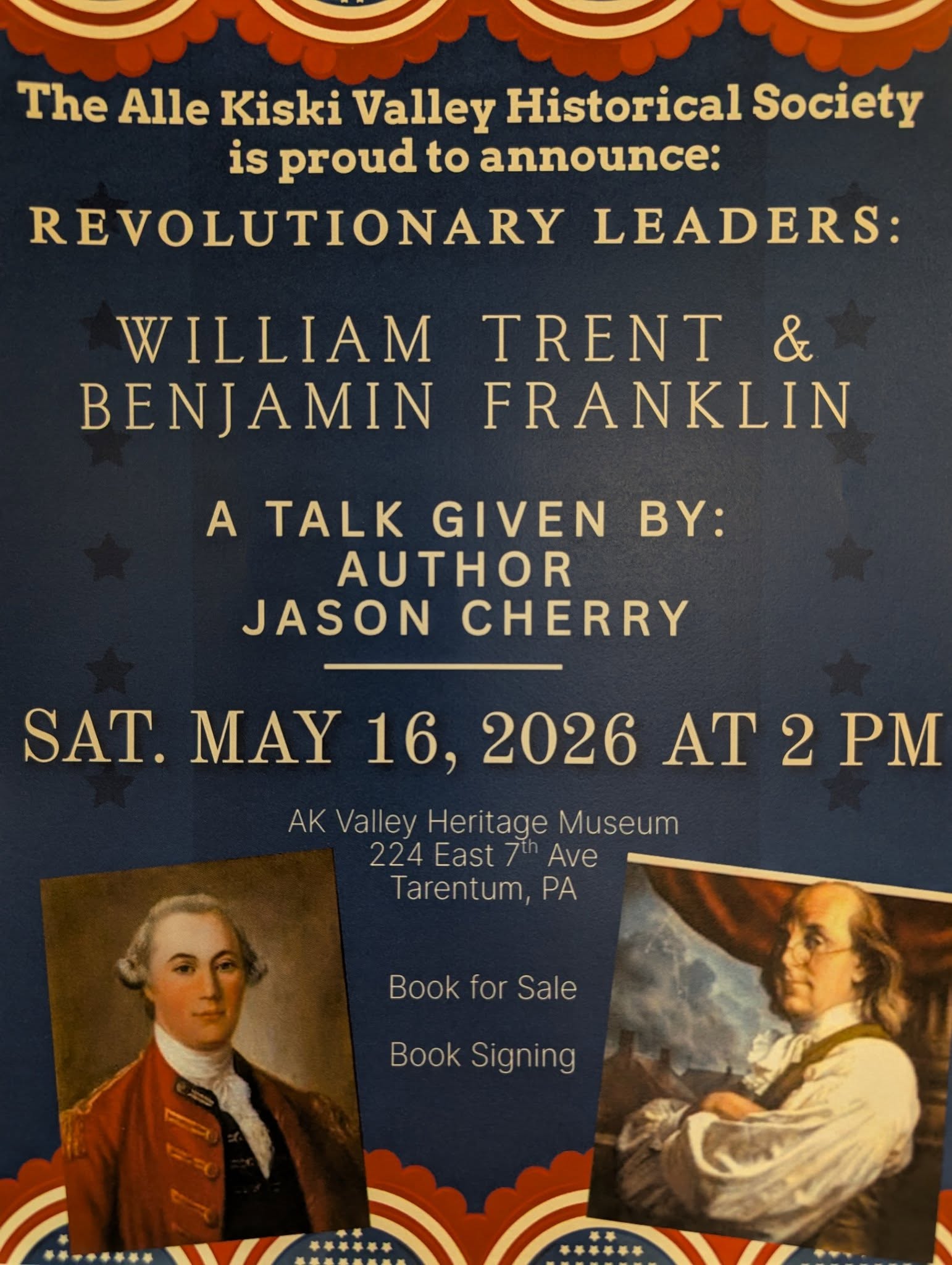 We will look at the relationship between two “Revolutionary” fathers, and learn about them in pre-revolutionary colonial times. Author and historical reenactor Jason Cherry will educate us at the AK Valley Heritage Museum.